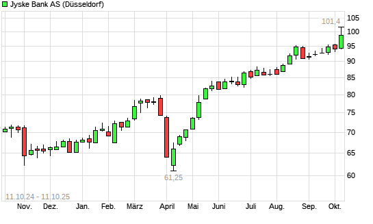 Mit dem Anstieg auf 98,40 EUR hat die Jyske Bank-Aktie (ISIN DK0010307958) am 10.10.2025 ein neues All-Time-High erreicht und damit den Kurs vom 09.10.2025 eingestellt.