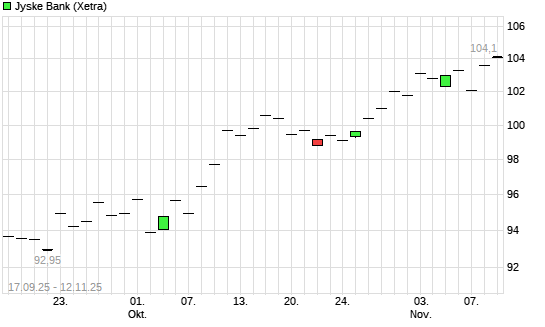 Mit dem Anstieg auf 104,30 EUR hat die Jyske Bank-Aktie (ISIN DK0010307958) am 11.11.2025 ein neues All-Time-High erreicht und damit den Kurs vom 10.11.2025 eingestellt.