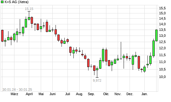 Mit dem Anstieg auf 12,96 EUR hat die K+S-Aktie (ISIN DE000KSAG888) am 29.01.2025 ein neues 6-Monats-Hoch erreicht und damit den Kurs vom 28.01.2025 eingestellt.