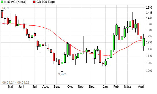 Mit dem Rücksetzer auf 11,80 EUR hat die K+S-Aktie am 08.04.2025 die 100-Tage-Linie nach unten gekreuzt.