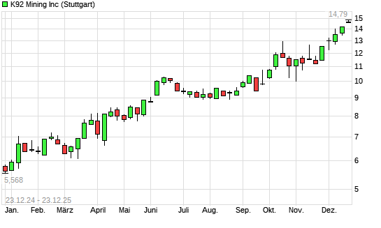 Mit dem Anstieg auf 14,50 EUR hat die K92 Mining-Aktie (ISIN CA4991131083) am 22.12.2025 ein neues All-Time-High erreicht und damit den Kurs vom 18.12.2025 eingestellt.