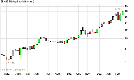 Mit dem Anstieg auf 18,00 EUR hat die K92 Mining-Aktie (ISIN CA4991131083) am 11.02.2026 ein neues All-Time-High erreicht und damit den Kurs vom 28.01.2026 eingestellt.