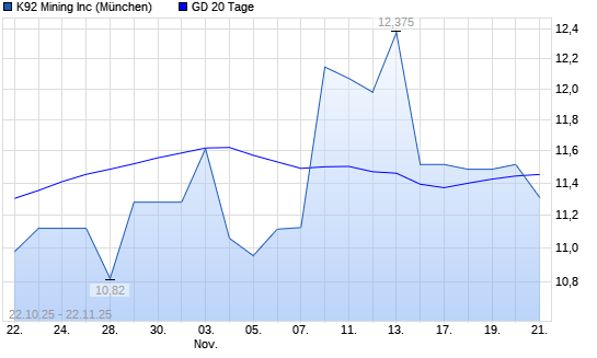Mit dem Rücksetzer auf 11,27 EUR hat die K92 Mining-Aktie am 21.11.2025 die 20-Tage-Linie nach unten gekreuzt.