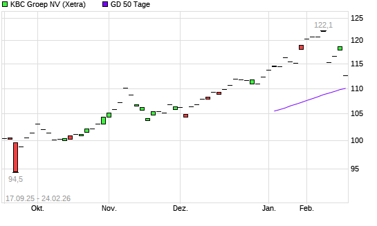Mit dem Rücksetzer auf 113,85 EUR hat die KBC Groep-Aktie am 25.02.2026 die 50-Tage-Linie nach unten gekreuzt.