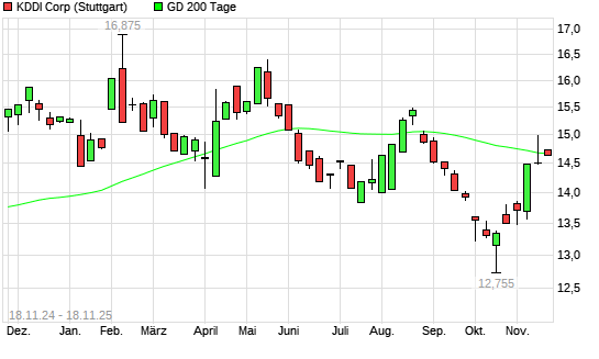 Mit dem Anstieg auf 14,73 EUR hat die KDDI-Aktie am 17.11.2025 die 200-Tage-Linie nach oben gekreuzt.