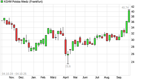Mit dem Anstieg auf 40,44 EUR hat die KGHM Polska Miedz-Aktie (ISIN PLKGHM000017) am 03.10.2025 ein neues 3-Jahres-Hoch erreicht und damit den Kurs vom 20.05.2024 eingestellt.