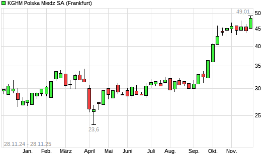 Mit dem Anstieg auf 48,99 EUR hat die KGHM Polska Miedz-Aktie (ISIN PLKGHM000017) am 27.11.2025 ein neues 3-Jahres-Hoch erreicht und damit den Kurs vom 26.11.2025 eingestellt.
