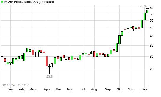 Mit dem Anstieg auf 58,98 EUR hat die KGHM Polska Miedz-Aktie (ISIN PLKGHM000017) am 11.12.2025 ein neues All-Time-High erreicht und damit den Kurs vom 10.12.2025 eingestellt.