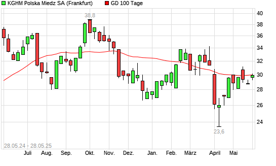 Mit dem Rücksetzer auf 29,51 EUR hat die KGHM Polska Miedz-Aktie am 27.05.2025 die 100-Tage-Linie nach unten gekreuzt.