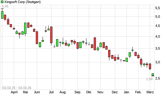 Mit dem Rücksetzer auf 2,60 EUR hat die KINGSOFT CORP-Aktie (ISIN KYG5264Y1089) am 02.03.2026 ein neues 12-Monats-Tief erreicht und damit den Kurs vom 27.02.2026 eingestellt.