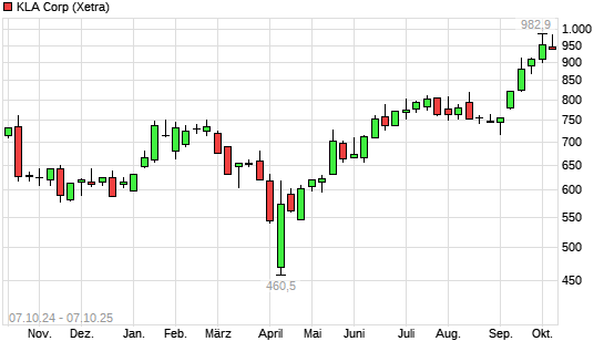 Mit dem Anstieg auf 972,50 EUR hat die KLA Corp.-Aktie (ISIN US4824801009) am 06.10.2025 ein neues All-Time-High erreicht und damit den Kurs vom 02.10.2025 eingestellt.