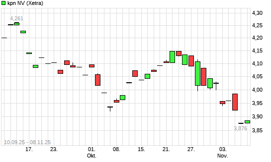 Mit dem Rücksetzer auf 3,87 EUR hat die KPN-Aktie (ISIN NL0000009082) am 07.11.2025 ein neues 6-Monats-Tief erreicht und damit den Kurs vom 01.08.2025 eingestellt.
