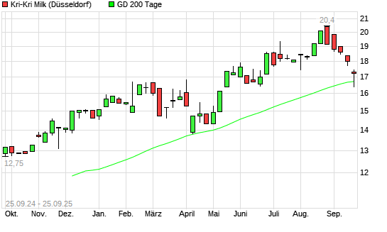 Mit dem Rücksetzer auf 16,90 EUR hat die KRI-KRI MILK NAM.-Aktie am 24.09.2025 die 200-Tage-Linie nach unten gekreuzt.