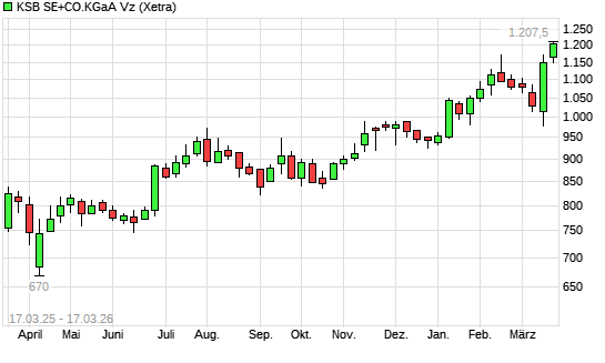 Mit dem Anstieg auf 1.205,00 EUR hat die KSB Vz-Aktie (ISIN DE0006292030) am 16.03.2026 ein neues All-Time-High erreicht und damit den Kurs vom 11.02.2026 eingestellt.