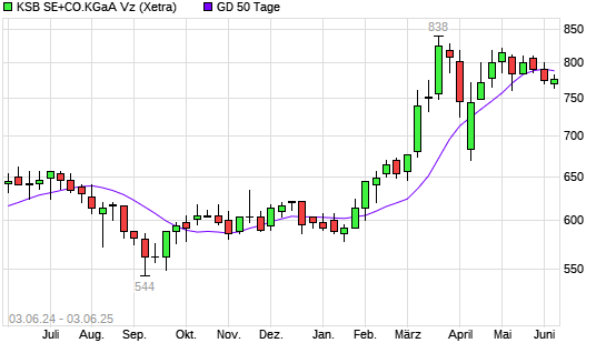 Mit dem Rücksetzer auf 780,00 EUR hat die KSB Vz-Aktie am 02.06.2025 die 50-Tage-Linie nach unten gekreuzt.