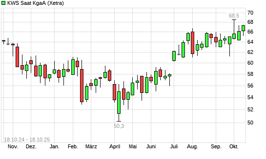 Mit dem Anstieg auf 67,10 EUR hat die KWS Saat-Aktie (ISIN DE0007074007) am 17.10.2025 ein neues 12-Monats-Hoch erreicht und damit den Kurs vom 16.10.2025 eingestellt.