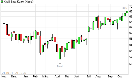 Mit dem Anstieg auf 68,20 EUR hat die KWS Saat-Aktie (ISIN DE0007074007) am 20.10.2025 ein neues 12-Monats-Hoch erreicht und damit den Kurs vom 17.10.2025 eingestellt.