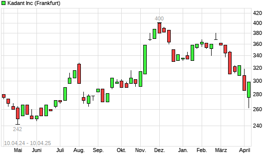 Mit dem Rücksetzer auf 262,00 EUR hat die Kadant-Aktie (ISIN US48282T1043) am 09.04.2025 ein neues 6-Monats-Tief erreicht und damit den Kurs vom 08.04.2025 eingestellt.