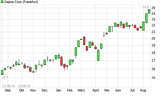 Mit dem Anstieg auf 24,60 EUR hat die Kajima-Aktie (ISIN JP3210200006) am 12.08.2025 ein neues All-Time-High erreicht und damit den Kurs vom 11.08.2025 eingestellt.