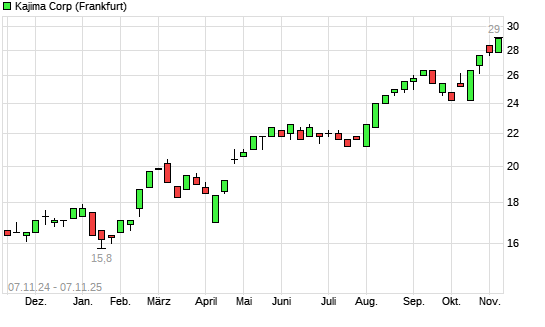 Mit dem Anstieg auf 29,00 EUR hat die Kajima-Aktie (ISIN JP3210200006) am 06.11.2025 ein neues All-Time-High erreicht und damit den Kurs vom 05.11.2025 eingestellt.