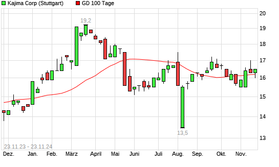 Mit dem Anstieg auf 16,50 EUR hat die Kajima-Aktie am 22.11.2024 die 100-Tage-Linie nach oben gekreuzt.