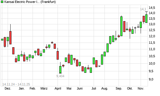 Mit dem Anstieg auf 14,10 EUR hat die Kansai Electric-Aktie (ISIN JP3228600007) am 13.11.2025 ein neues 12-Monats-Hoch erreicht und damit den Kurs vom 12.11.2025 eingestellt.