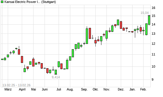 Mit dem Anstieg auf 14,80 EUR hat die Kansai Electric-Aktie (ISIN JP3228600007) am 12.02.2026 ein neues 12-Monats-Hoch erreicht und damit den Kurs vom 28.11.2025 eingestellt.