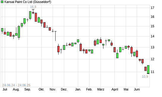 Mit dem Rücksetzer auf 11,00 EUR hat die Kansai Paint-Aktie (ISIN JP3229400001) am 23.06.2025 ein neues 12-Monats-Tief erreicht und damit den Kurs vom 16.06.2025 eingestellt.