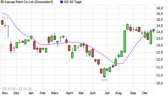 Mit dem Anstieg auf 14,20 EUR hat die Kansai Paint-Aktie am 22.10.2025 die 50-Tage-Linie nach oben gekreuzt.