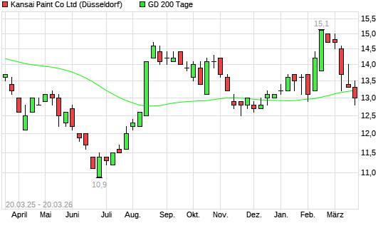 Mit dem Rücksetzer auf 13,00 EUR hat die Kansai Paint-Aktie am 19.03.2026 die 200-Tage-Linie nach unten gekreuzt.