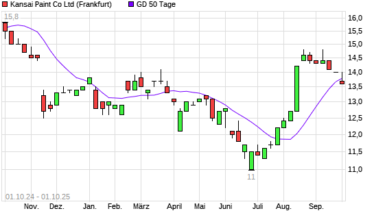 Mit dem Rücksetzer auf 13,70 EUR hat die Kansai Paint-Aktie am 30.09.2025 die 50-Tage-Linie nach unten gekreuzt.