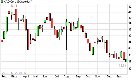 Mit dem Rücksetzer auf 33,12 EUR hat die Kao-Aktie (ISIN JP3205800000) am 19.01.2026 ein neues 12-Monats-Tief erreicht und damit den Kurs vom 14.01.2026 eingestellt.