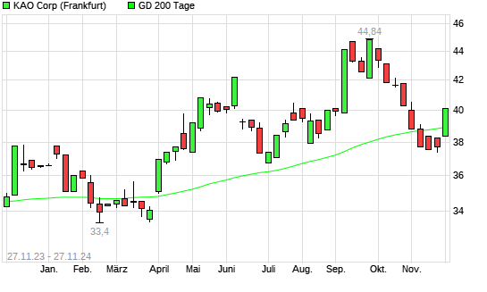 Mit dem Anstieg auf 40,03 EUR hat die Kao-Aktie am 26.11.2024 die 200-Tage-Linie nach oben gekreuzt.