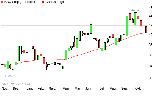 Mit dem Rücksetzer auf 40,36 EUR hat die Kao-Aktie am 24.10.2024 die 100-Tage-Linie nach unten gekreuzt.