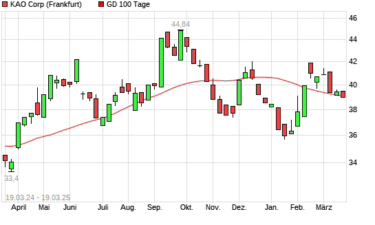 Mit dem Rücksetzer auf 38,99 EUR hat die Kao-Aktie am 18.03.2025 die 100-Tage-Linie nach unten gekreuzt.