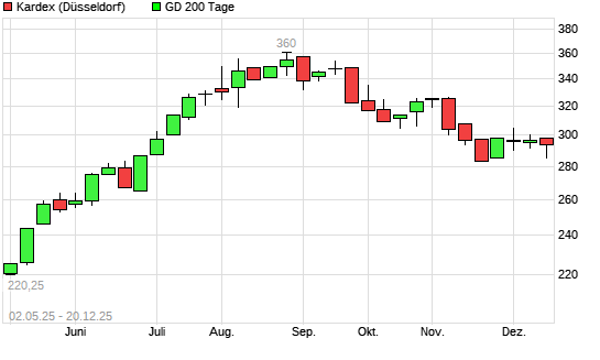 Mit dem Anstieg auf 292,00 EUR hat die Kardex-Aktie am 19.12.2025 die 200-Tage-Linie nach oben gekreuzt.