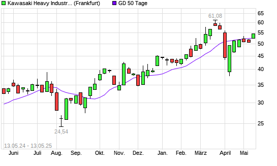 Mit dem Anstieg auf 53,58 EUR hat die Kawasaki Heavy-Aktie am 12.05.2025 die 50-Tage-Linie nach oben gekreuzt.
