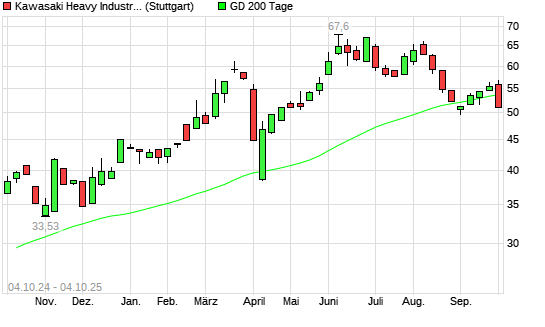 Mit dem Rücksetzer auf 53,26 EUR hat die Kawasaki Heavy-Aktie am 03.10.2025 die 200-Tage-Linie nach unten gekreuzt.