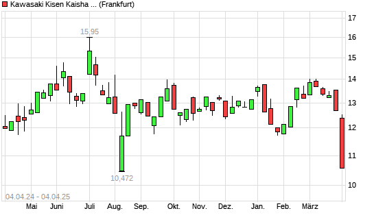 Mit dem Rücksetzer auf 11,24 EUR hat die Kawasaki Kisen Kaisha-Aktie (ISIN JP3223800008) am 03.04.2025 ein neues 3-Jahres-Tief erreicht und damit den Kurs vom 05.08.2024 eingestellt.