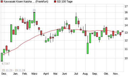 Mit dem Anstieg auf 13,22 EUR hat die Kawasaki Kisen Kaisha-Aktie am 18.11.2024 die 100-Tage-Linie nach oben gekreuzt.