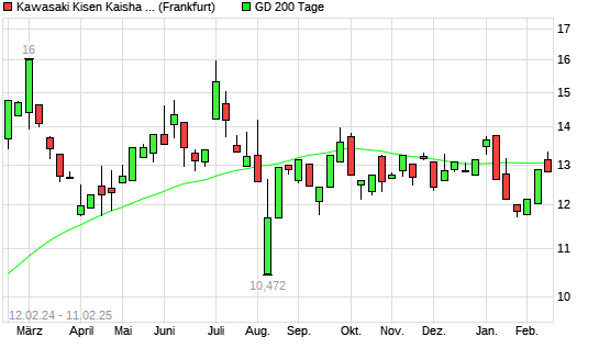 Mit dem Anstieg auf 13,34 EUR hat die Kawasaki Kisen Kaisha-Aktie am 10.02.2025 die 200-Tage-Linie nach oben gekreuzt.