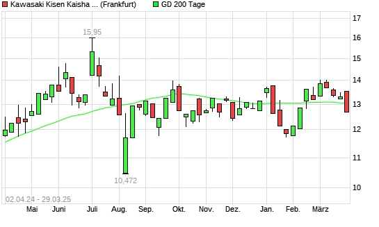 Mit dem Rücksetzer auf 12,69 EUR hat die Kawasaki Kisen Kaisha-Aktie am 28.03.2025 die 200-Tage-Linie nach unten gekreuzt.