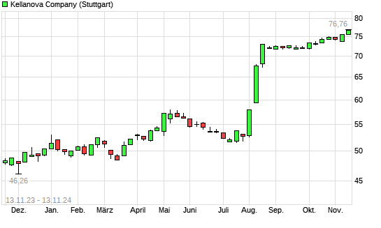 Mit dem Anstieg auf 76,02 EUR hat die Kellogg-Aktie (ISIN US4878361082) am 12.11.2024 ein neues All-Time-High erreicht und damit den Kurs vom 11.11.2024 eingestellt.