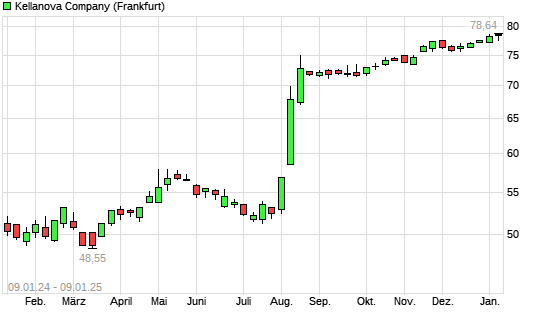 Mit dem Anstieg auf 78,44 EUR hat die Kellogg-Aktie (ISIN US4878361082) am 08.01.2025 ein neues All-Time-High erreicht und damit den Kurs vom 03.01.2025 eingestellt.