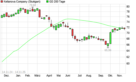 Mit dem Rücksetzer auf 71,18 EUR hat die Kellogg-Aktie am 13.11.2025 die 200-Tage-Linie nach unten gekreuzt.