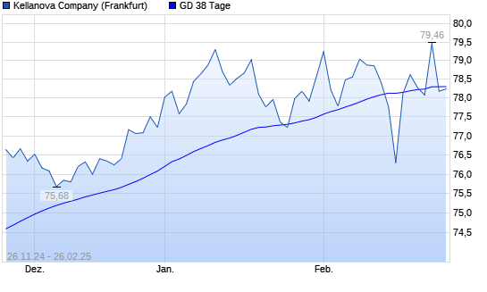 Mit dem Rücksetzer auf 78,18 EUR hat die Kellogg-Aktie am 25.02.2025 die 38-Tage-Linie nach unten gekreuzt.