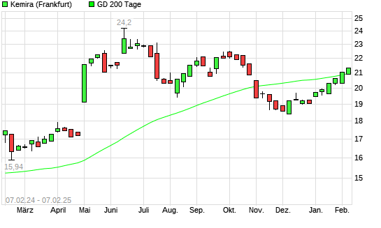 Mit dem Anstieg auf 21,06 EUR hat die Kemira-Aktie am 06.02.2025 die 200-Tage-Linie nach oben gekreuzt.