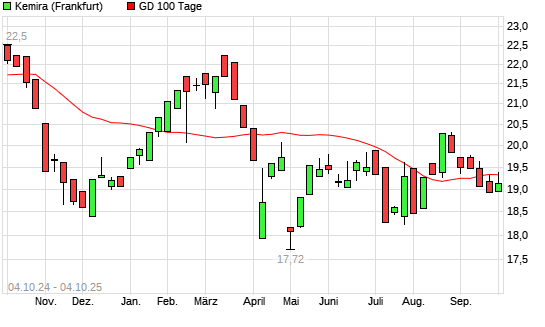 Mit dem Rücksetzer auf 19,13 EUR hat die Kemira-Aktie am 03.10.2025 die 100-Tage-Linie nach unten gekreuzt.