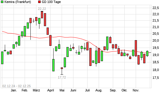 Mit dem Rücksetzer auf 19,15 EUR hat die Kemira-Aktie am 01.12.2025 die 100-Tage-Linie nach unten gekreuzt.