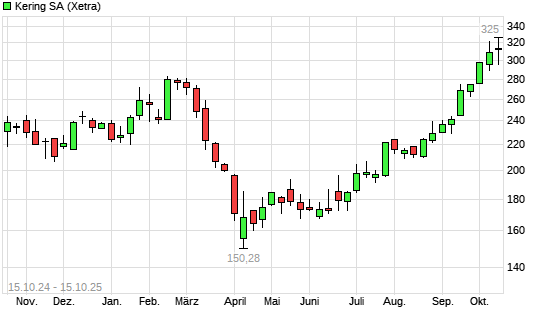 Mit dem Anstieg auf 318,15 EUR hat die Kering-Aktie (ISIN FR0000121485) am 14.10.2025 ein neues 12-Monats-Hoch erreicht und damit den Kurs vom 08.10.2025 eingestellt.